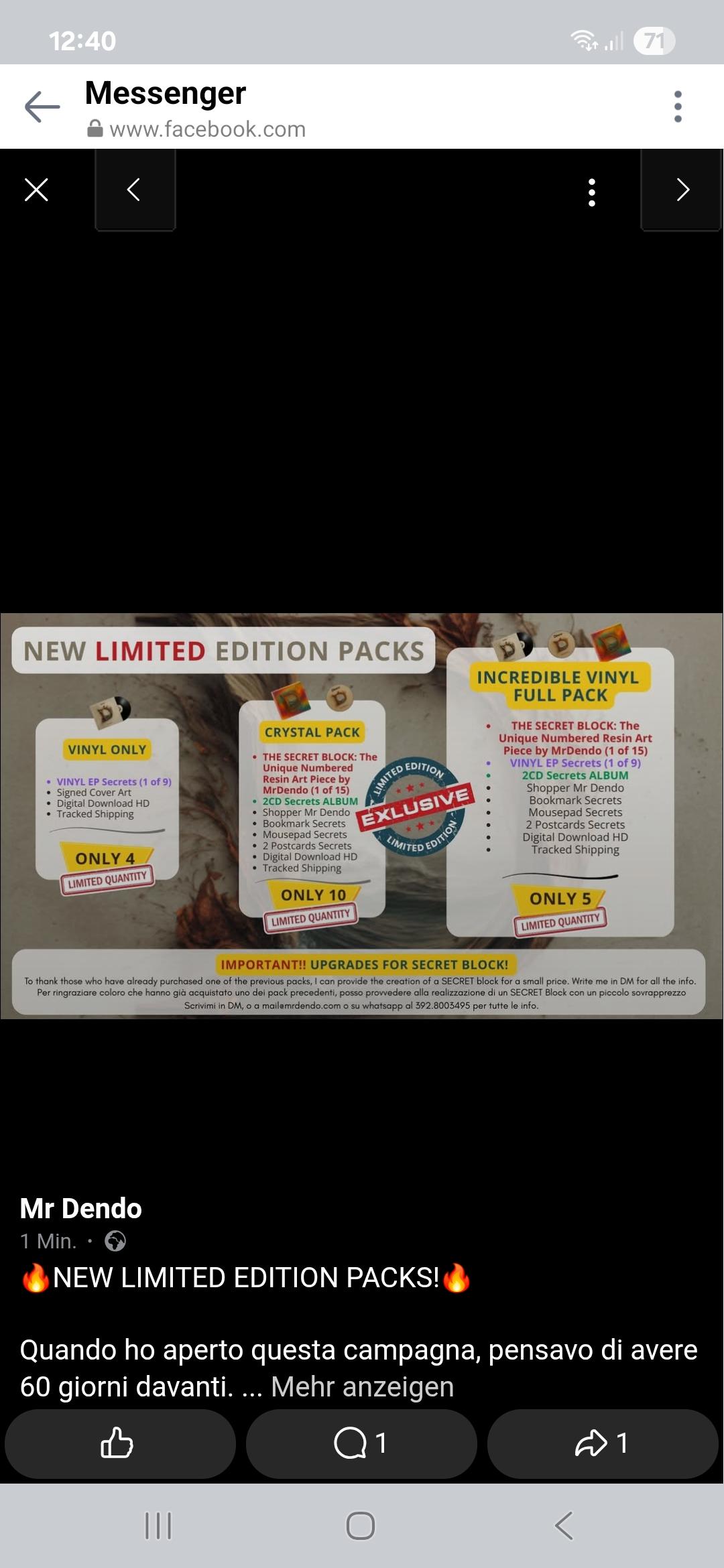 No need to worry, write an email to Mr Dendo. 🔥IMPORTANT UPDATE 🔥 Per coloro che hanno già acquistato un pack e volessero ricevere anche il Secret Block di Resina o volesso acquistare uno dei 5 Vinili Numerati da Collezione restanti può scrivermi un messaggio qui o a mail@mrdendo.com. Ci tengo inoltre ancora una volta a ringraziarvi perchè i nuovi pack non erano assolutamente previsti all’inizio della campagna. L’idea di aggiungere I Vinili Trasparenti in edizione limitata (i cui costi di produzione sono decisamente alti) e i Resin Block da Collezione è nata SOLO perché, grazie a VOI, in appena 4 giorni è stato raggiunto l’obiettivo che pensavo di impiegare 60 giorni a centrare. È stato un risultato incredibile, e mi sono detto: “Con tutto questo tempo in più, voglio creare qualcosa di speciale, un vero e proprio ringraziamento artistico per chi mi ha sostenuto”. Quindi Ancora Grazie di Cuore a Tutti i Supporters! 🙏❤️ 🇬🇧 English 🔥 IMPORTANT UPDATE 🔥 For those who have already purchased a pack and would also like to receive the Secret Resin Block, or wish to buy one of the remaining 5 Numbered Collector’s Vinyls, please send me a message here or at mail@mrdendo.com Once again, I want to thank you, because these new packs were absolutely not planned at the beginning of the campaign. The idea of adding the Transparent Limited Edition Vinyls (whose production costs are very high) and the Collector’s Resin Blocks was born ONLY because, thanks to YOU, in just 4 days we reached the goal I thought would take 60 days to achieve. It was an incredible result, and I said to myself: “With all this extra time, I want to create something special — a true artistic thank you for those who supported me.” So once again, thank you from the bottom of my heart to all supporters! 🙏❤️ 🇩🇪 Deutsch 🔥 WICHTIGES UPDATE 🔥 Für alle, die bereits ein Pack gekauft haben und nun auch den Secret Resin Block erhalten möchten oder eines der verbleibenden 5 nummerierten Sammler-Vinyls erwerben wollen, schreibt mir bitte hier oder an mail@mrdendo.com Ich möchte euch noch einmal von Herzen danken, denn diese neuen Packs waren zu Beginn der Kampagne absolut nicht geplant. Die Idee, die Transparenten Limited Edition Vinyls (deren Produktionskosten sehr hoch sind) und die Sammler-Resin Blocks hinzuzufügen, entstand NUR, weil wir – dank EUCH – in nur 4 Tagen das Ziel erreicht haben, von dem ich dachte, dass ich dafür 60 Tage brauchen würde. Das war ein unglaubliches Ergebnis, und ich habe mir gesagt: „Mit all dieser zusätzlichen Zeit möchte ich etwas Besonderes schaffen – ein echtes künstlerisches Dankeschön an alle, die mich unterstützt haben.“ Darum noch einmal: Vielen Dank von Herzen an alle Supporter! 🙏❤️ Recap dei Nuovi Oggetti! 💎 Nascono i SECRET BLOCK !💎 piccoli blocchi di resina, 10×10x1 cm, realizzati interamente a mano da me. Dentro ognuno vive un frammento dell’album, le sue frasi ed i suoi colori. Tutto Sospeso per sempre. Edizione limitata: 15 pezzi unici, irripetibili, imperfetti, autentici, numerati e firmati a mano da me. 💿 Arrivano anche i VINILI! Un sogno che diventa realtà, stampato in tiratura limitata "Transparent" di sole 9 copie, ognuna firmata e numerata a mano da me. 8 Tracce. L'ESSENZA di SECRETS. I vinili saranno disponibili sia da soli, sia in un pack speciale che racchiude tutto: CD, Gadget, Vinile, Secret Block e Digital Download 9 Pezzi da Collezione, Unici. ✨ Tutto questo è per voi che avete reso possibile questo Viaggio. Per coloro che hanno già acquistato un pack e volessero ricevere anche il Secret Block di Resina o volesso acquistare uno dei 5 Vinili Numerati da Collezione restanti può scrivermi un messaggio qui o a mail@mrdendo.com.2 Punkte